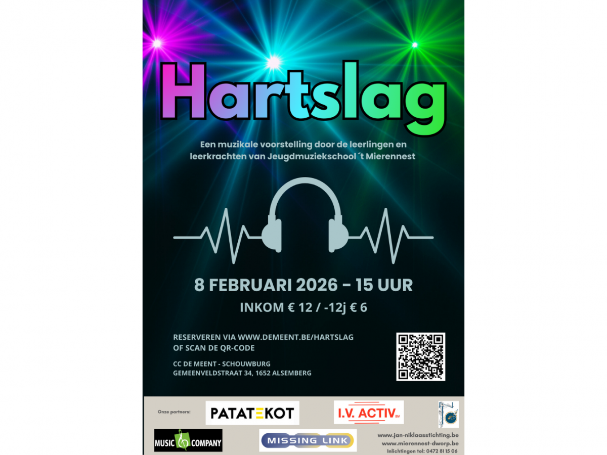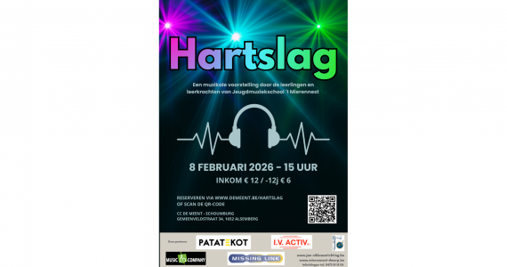 Hartslag is een muzikale voorstelling, gebracht door de leerlingen van Jeugdmuziekschool ´t Mierennest Dworp. Meer dan 70 leerlingen zullen op het podium zingen en op instrumenten spelen.
